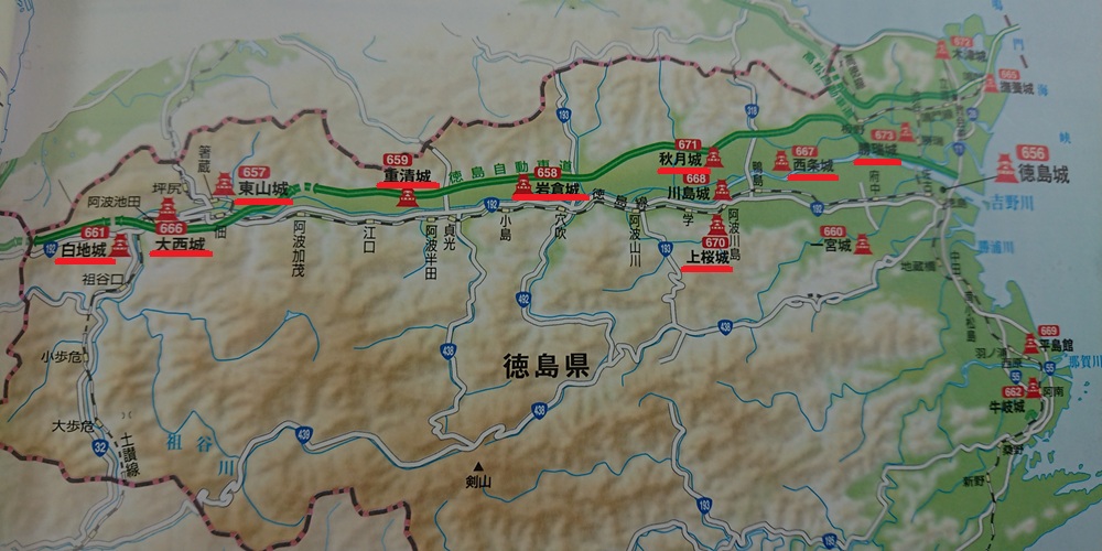 土曜日の午前中に香川県を出発し、徳島県吉野川沿いの城跡9つを巡り、道の駅で車中泊。日曜日の朝一には出発し、8:00ごろには香川に帰ってきて、いつもの日曜日を過ごしました。総走行距離は約300km。高速道路は利用無し。立ち寄ったお城を少しづつ紹介します。